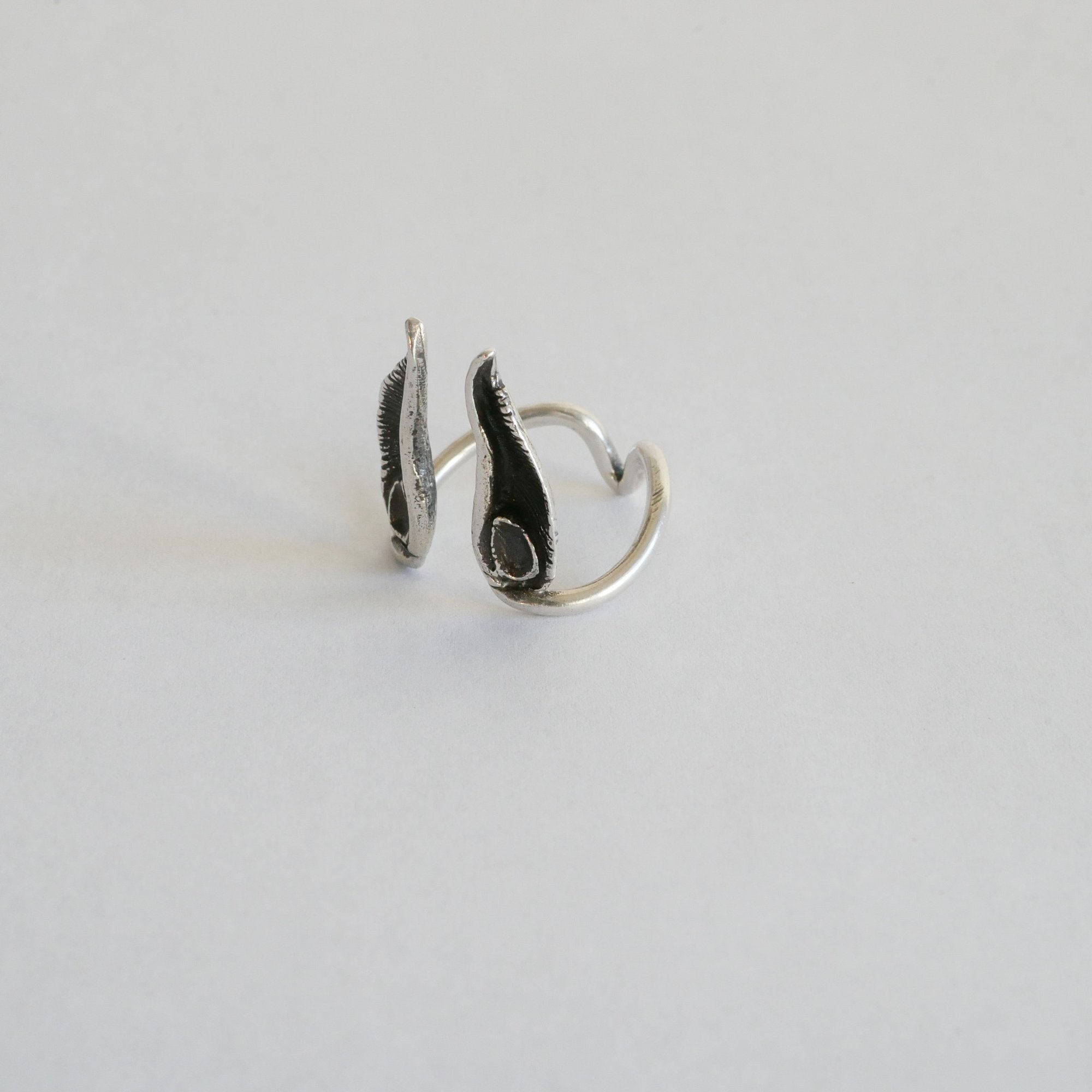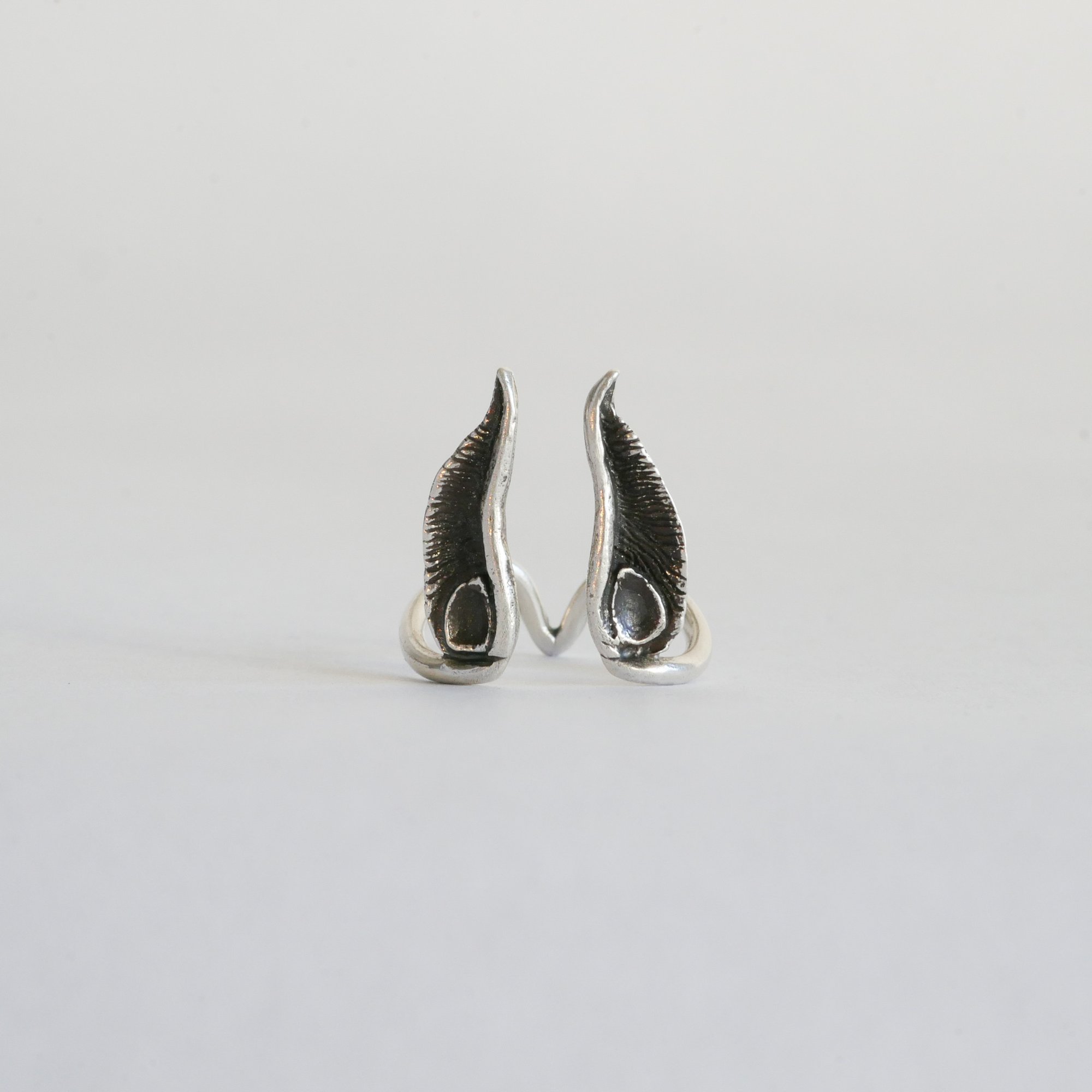 This ring was inspired by a photo I saw of a baby bat. It had the cutest big ears. I then learned that when they are babies their ears are really big and they grow into them as they become adults. So I started carving the design in wax without knowing what it would become. As I placed them on my finger I knew I wanted to make an open ring.